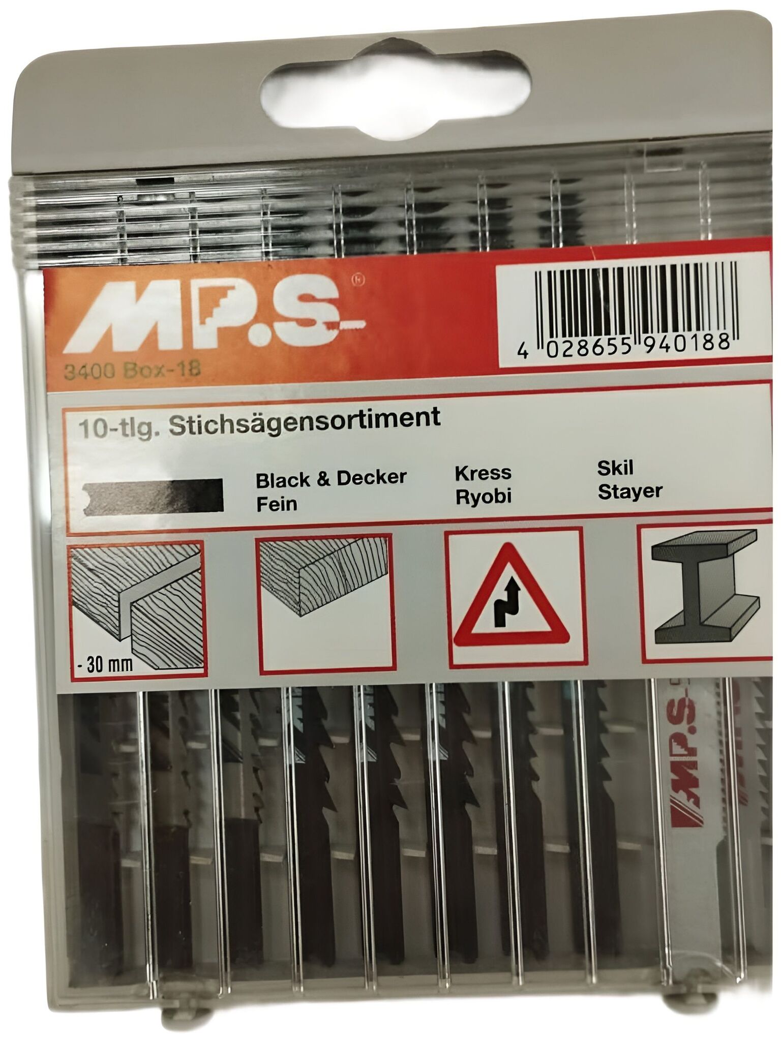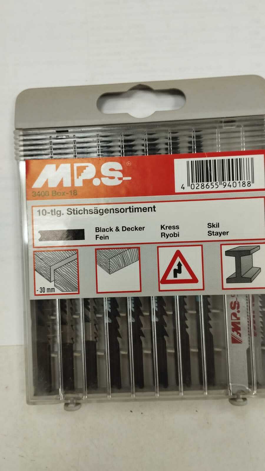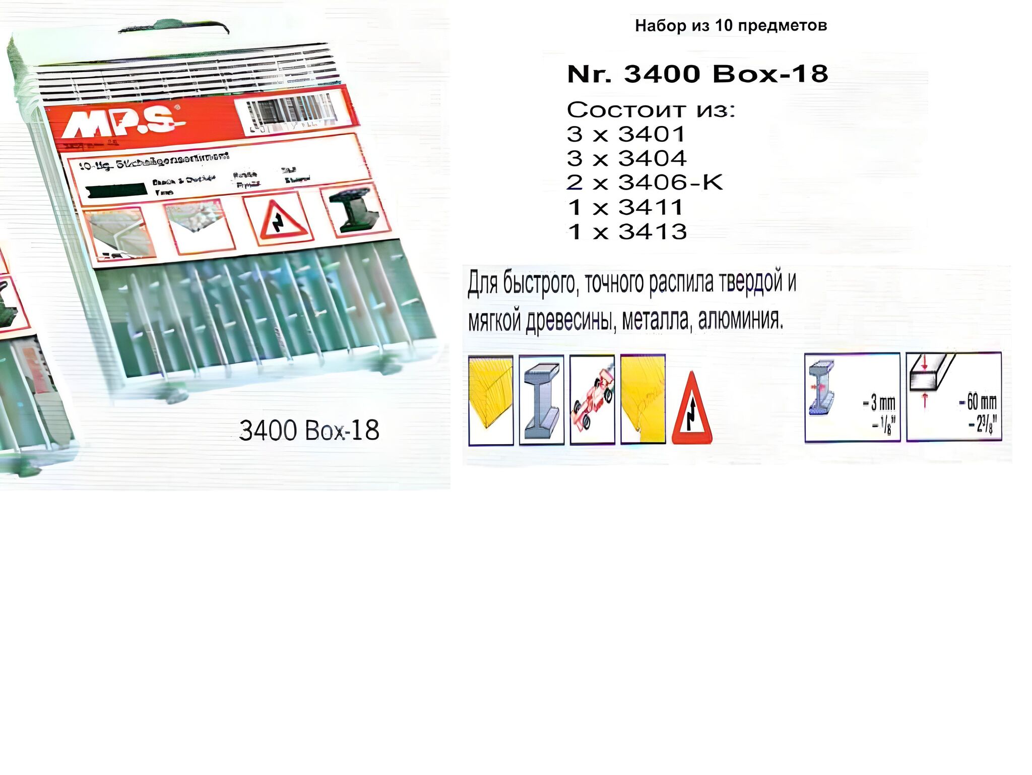 Набор пилок по дереву пластику и металлу 3400-18 MP.S с U- образным хвостовиком, состоит из пилок 10 пилок: 3401- 3 шт, 3404- 3шт, 3406-K -2шт, 3411-1шт, 3413-1шт. Для быстрого г точного распила в твёрдой и мягкой древесины, металла, алюминия.
