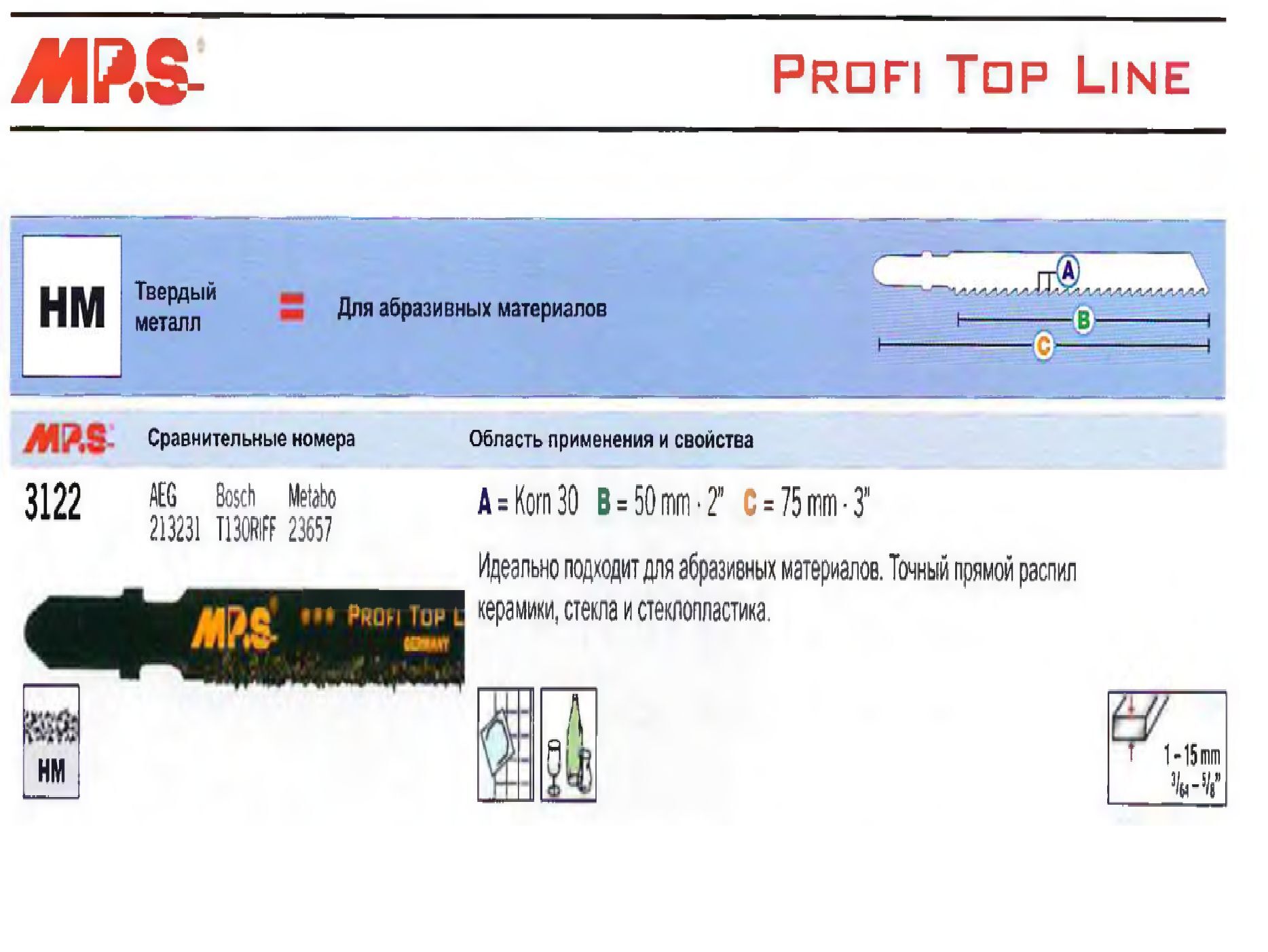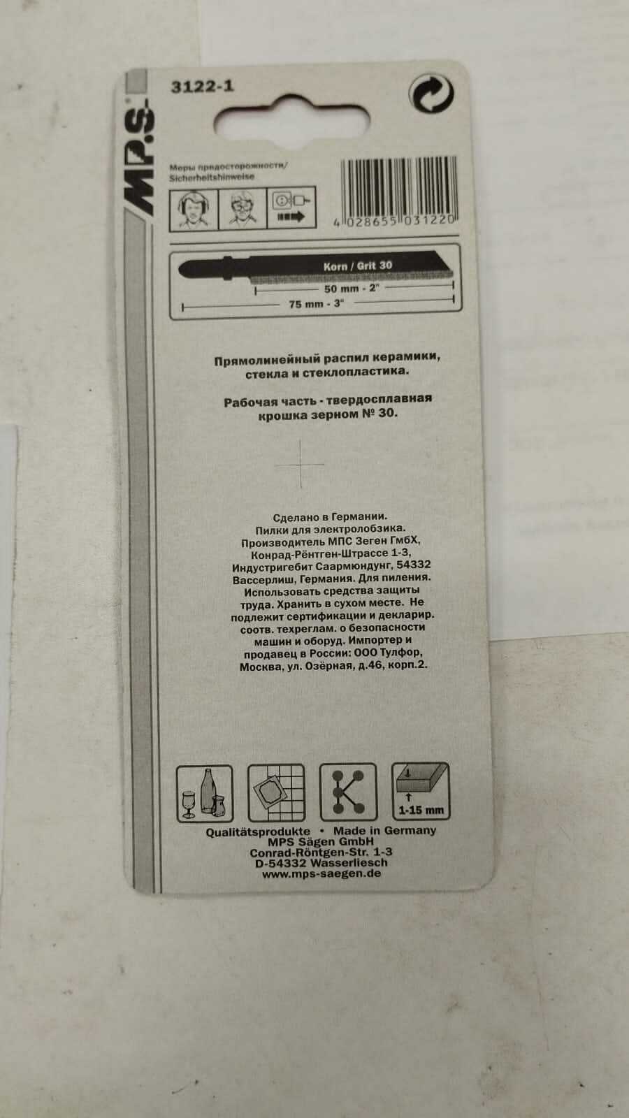 Пилки 3122-1MP.S, произведены в Германии, в комплекте 1 шт. Пилка имеет рабочую поверхность из твёрдого металла Korn 30. Идеально подходит для абразивных материалов, точный прямой распил керамики, стекла и стеклопластика.