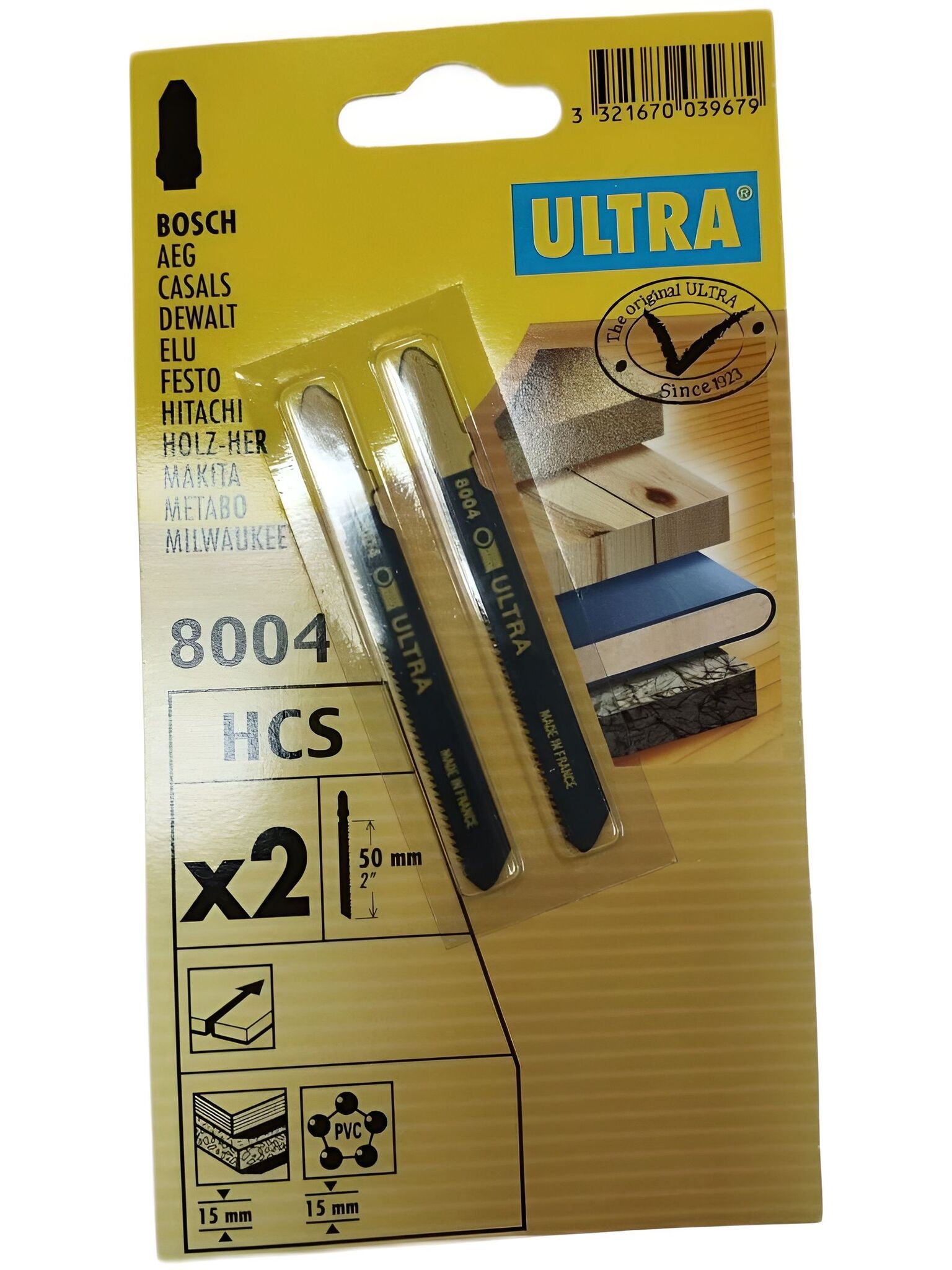 Пилки 8004-2 Ultra произведены во Франции, в упаковке 2 шт.С Т- образным хвостовиком, длинна 50мм, подходят для пиления древесины, фанеры, ДСП, пластика. Прямолинейное пиление.