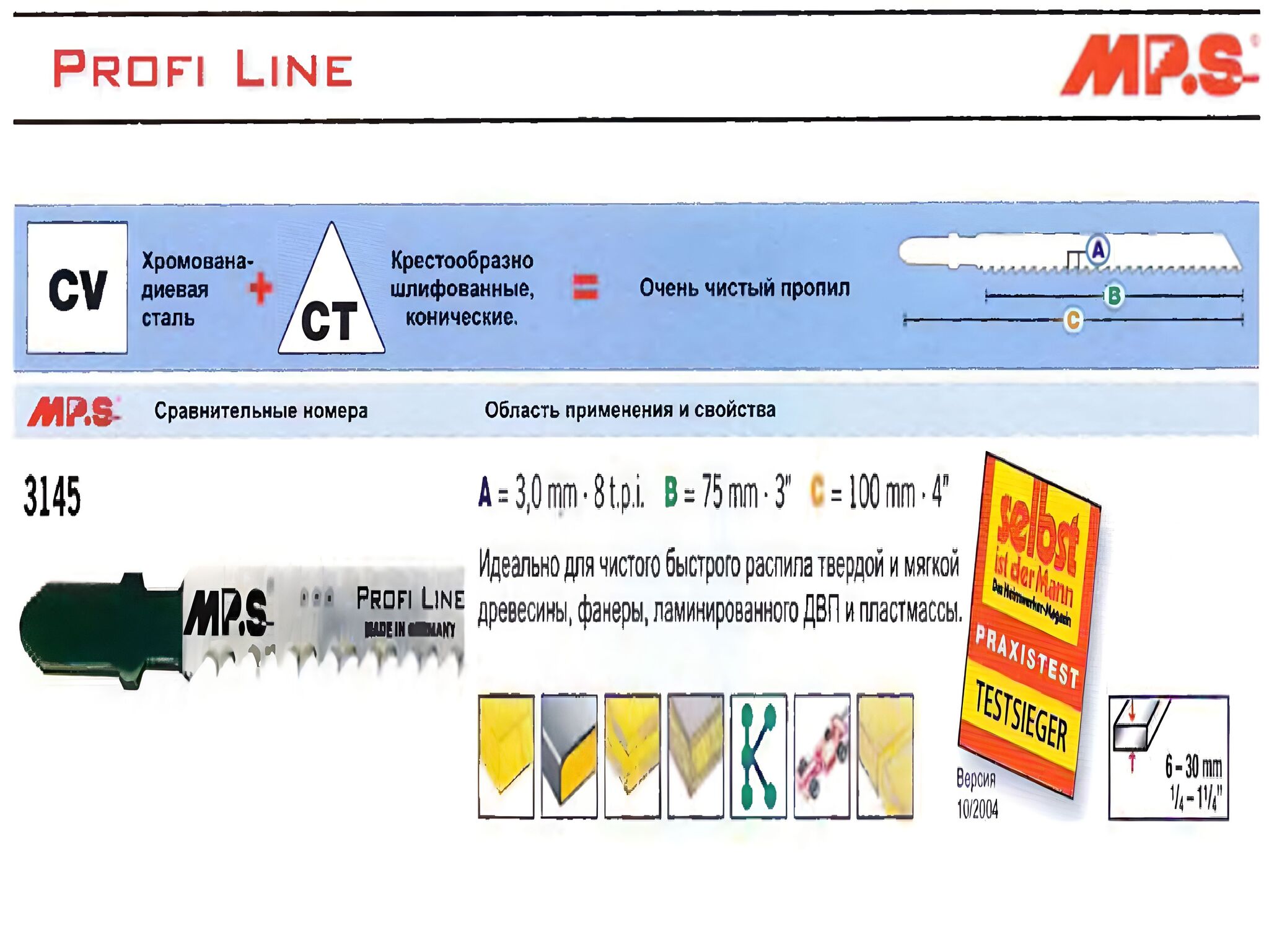 Пилки по 3145-1MP.S по твёрдой и мягкой древксине, фанере, ламинированному ДВП, пластику идеально для быстрого чистого распила. Произведены в Германии.шаз зуба 3мм, общая длина 100мм, рабочая длина 75мм. Толщина распиливаемого материала от 6 до 30мм .