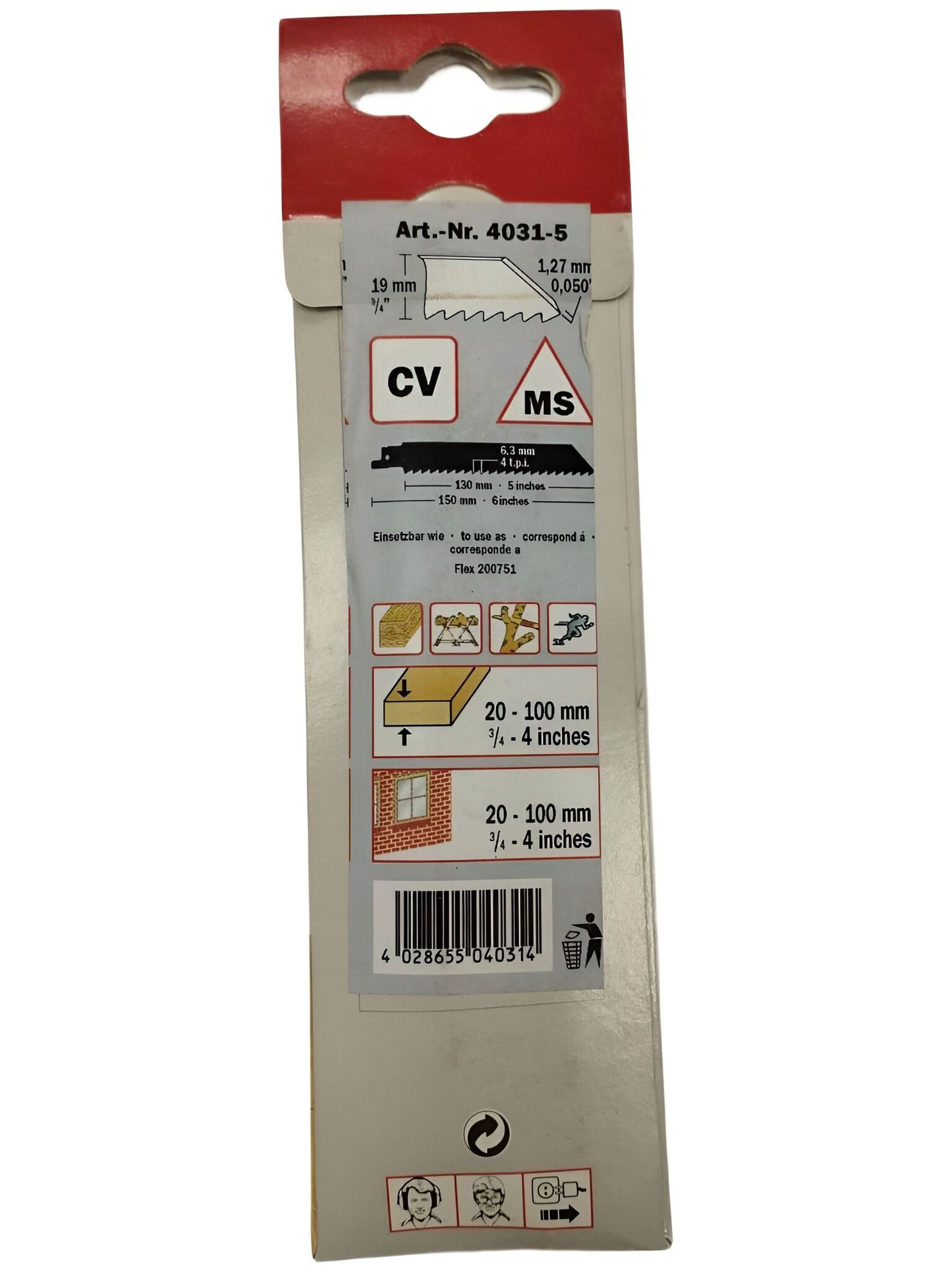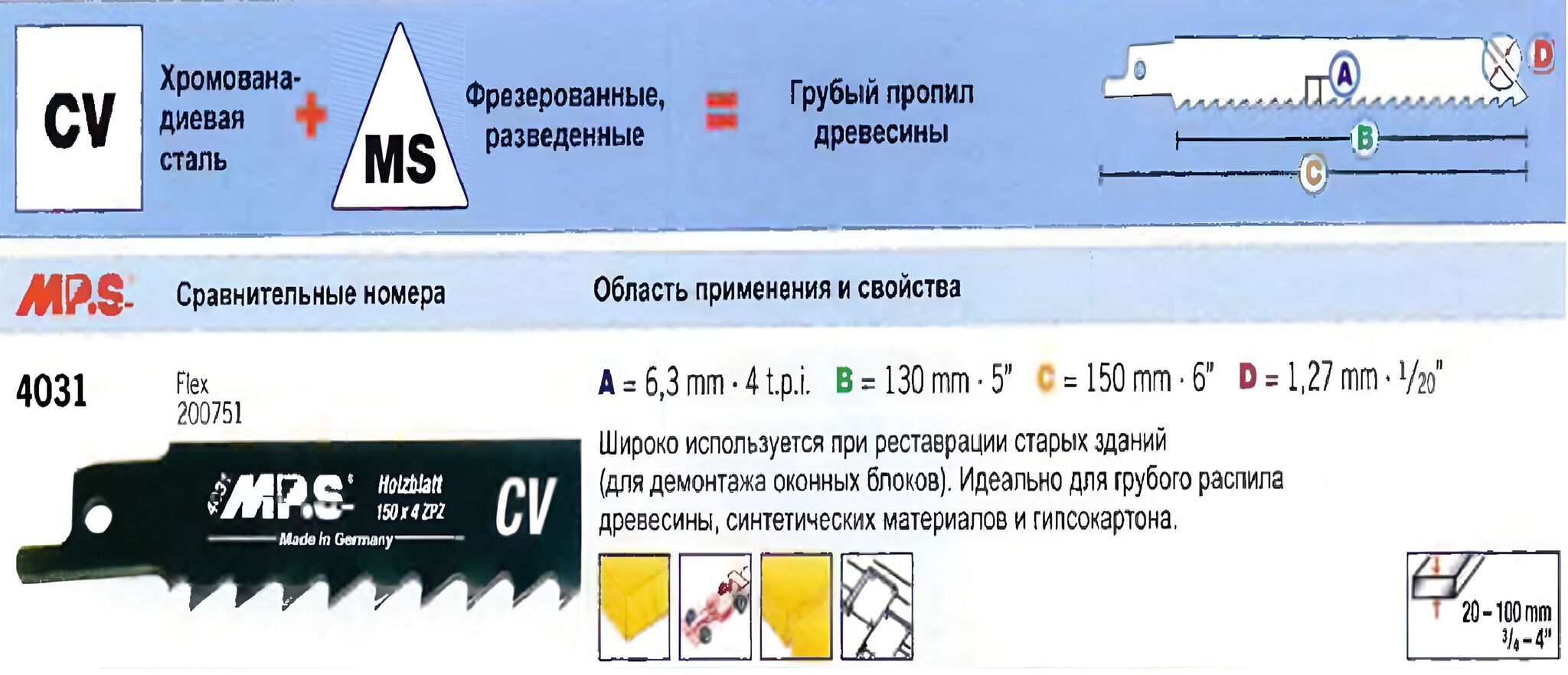 Пилки для сабельной пилы 4031-5 MP.S -изготовлено в Германии, из хром ванадиевой стали, фрезированные разведённые зубья, грубый распил, длинна полотна 150мм, рабочая длинна 130мм, шаг зуба 6,3мм, широко используются для реставрации старых зданий (демонтажа оконных блоков). Идеально для грубого распила древесины, синтетических материалов, гипсокартона.